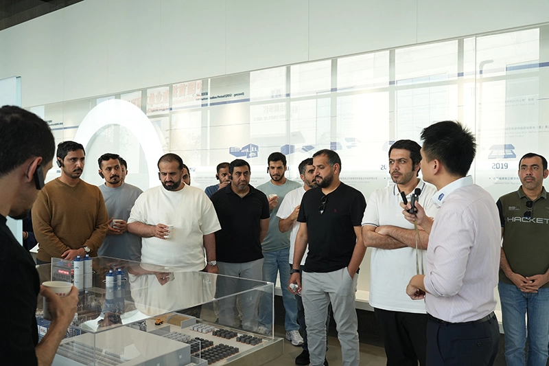 En el centro de control de la Plataforma de Servicio en la Nube de Equipos Inteligentes, la delegación observó un escenario de operación y mantenimiento inteligente que demuestra cómo se pueden monitorear los equipos de forma remota. Como innovación central de Quanzhou Machinery, esta plataforma integra tecnologías de vanguardia como computación en la nube, big data e inteligencia artificial. Puede recopilar datos operativos en tiempo real de más de 1000 unidades de equipos inteligentes en todo el mundo, lo que permite funciones de gestión del ciclo de vida completo que incluyen monitoreo en línea, actualizaciones remotas, predicción y diagnóstico de fallas y evaluación del estado del equipo. Los miembros de la delegación preguntaron sobre los casos de aplicación de la plataforma y la velocidad de respuesta del servicio en Medio Oriente, y elogiaron mucho sus soluciones de operación y mantenimiento eficientes y de bajo costo para clientes extranjeros. Creían que esta tecnología satisface perfectamente la demanda del sector de infraestructura de los EAU de equipos inteligentes y eficientes.